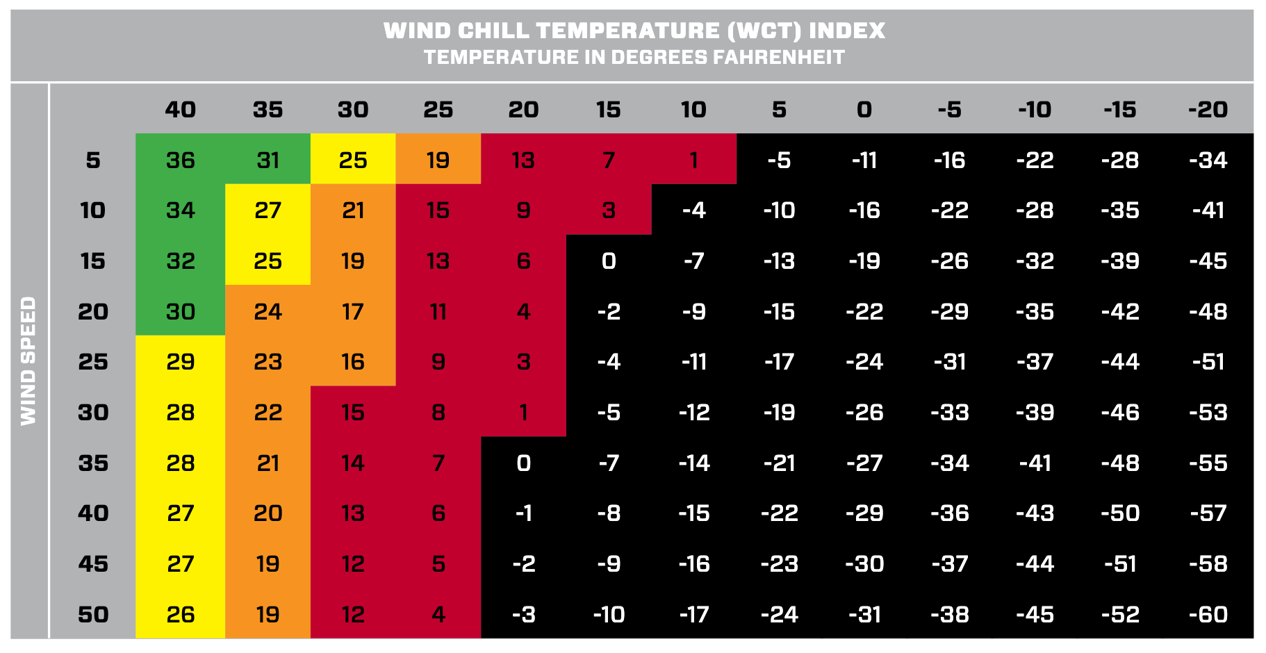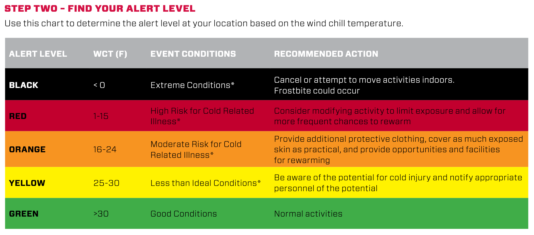 For these reasons, US Soccer has created a series of Cold Weather Guidelines that we consult when it gets cold. It is based not only on the temperature, but the Wind Chill Factor (WCF). You can see the charts below as an aid to calculate this number and see the corresponding warning or suggestion.